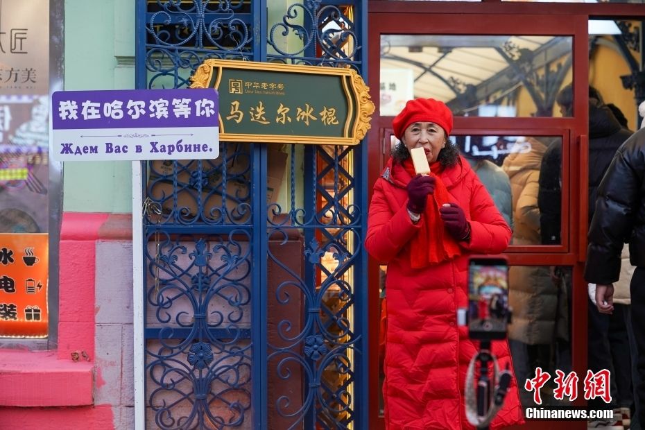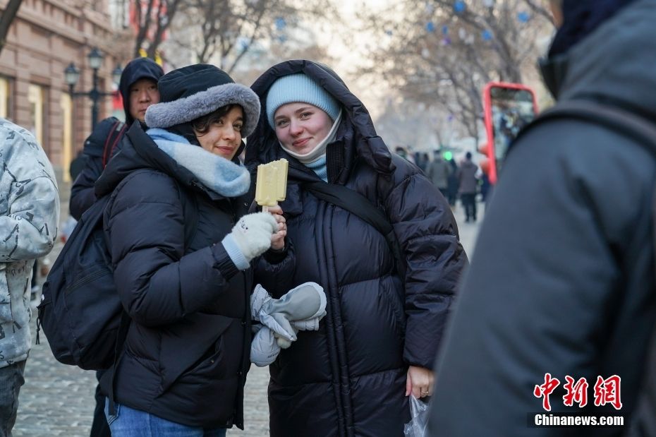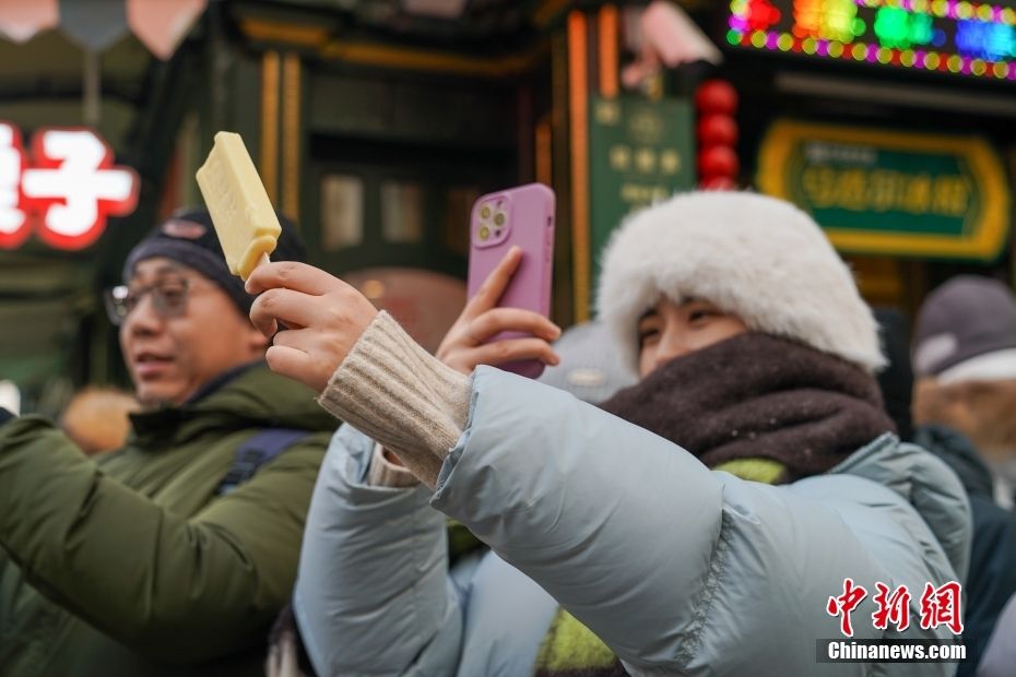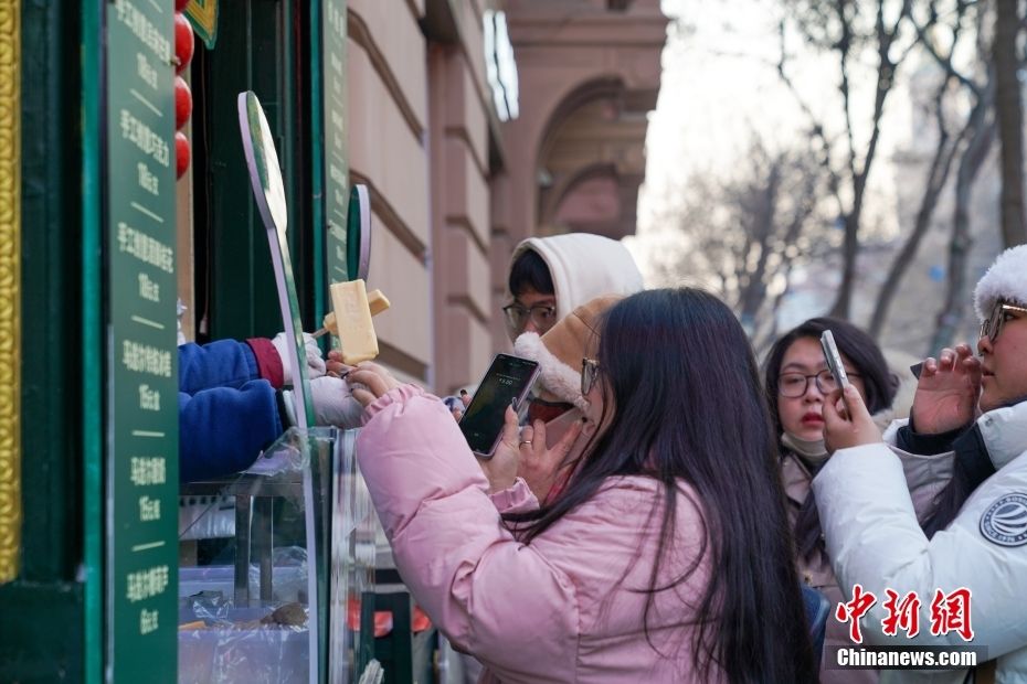 1月2日,在黑龙江哈尔滨中央大街,游客身着厚衣服在寒冷的天气中品尝雪糕,手拿雪糕拍照,成为哈尔滨冬日一景。图为游客拍摄雪糕。中新网