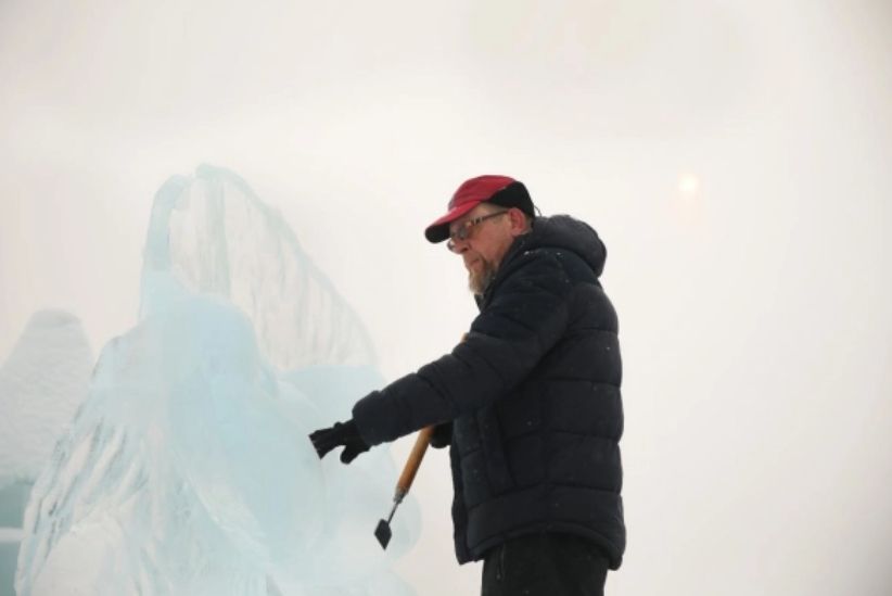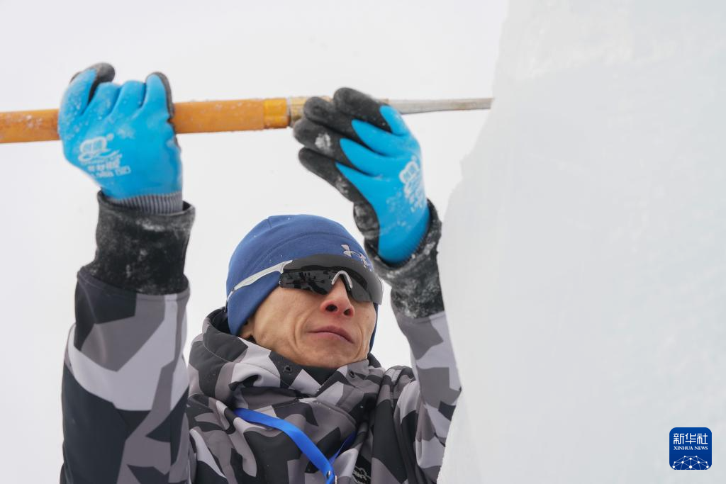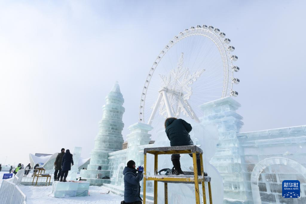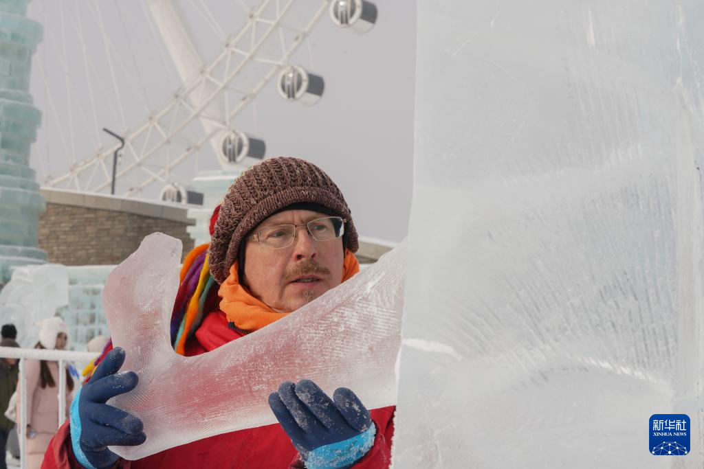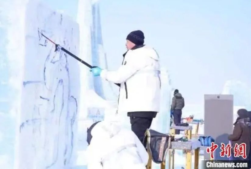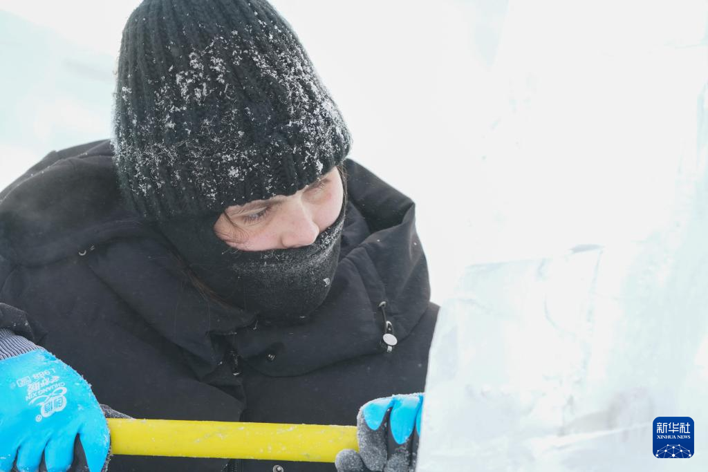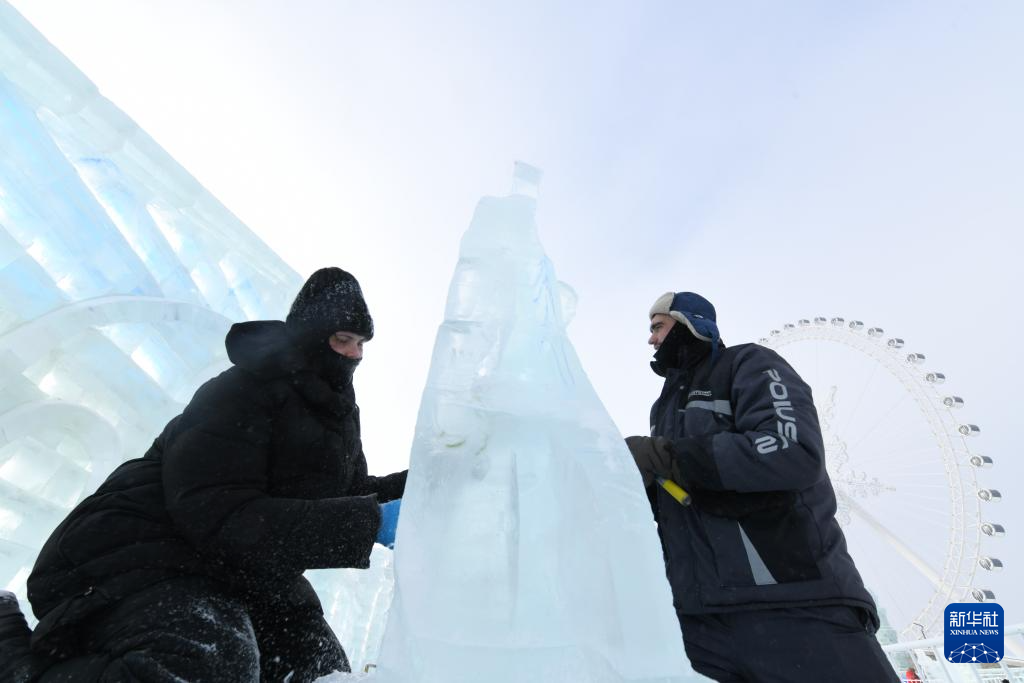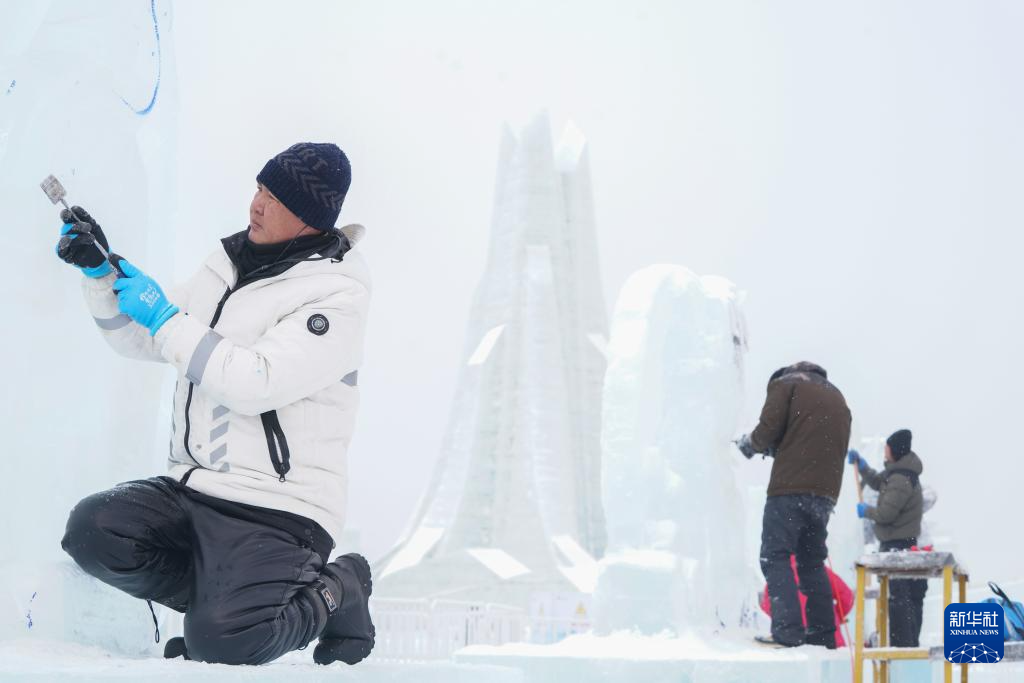1月3日,在哈尔滨冰雪大世界进行的第35届中国·哈尔滨国际冰雕比赛进入第二天的赛程,来自世界各地的30余支参赛队伍精心雕琢,尽显哈尔滨冬季极寒之美。图为1月3日,参赛选手在进行冰雕创作。新华社