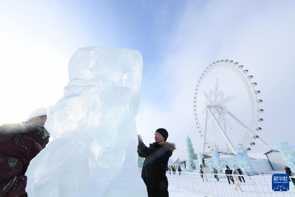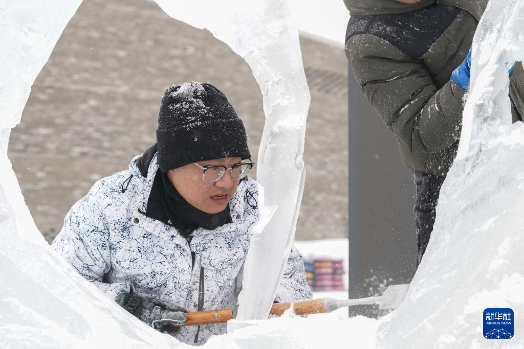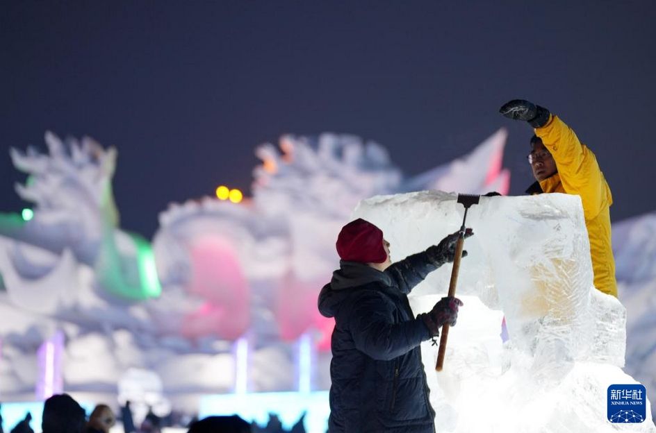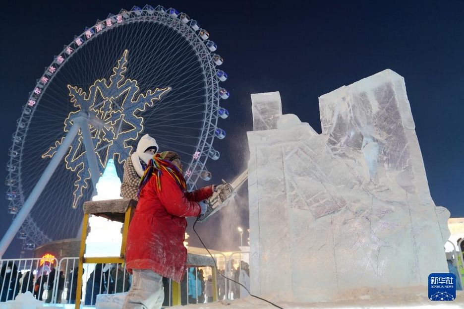 1月2日,在冰雪大世界园区内,参赛选手在进行冰雕创作。新华社