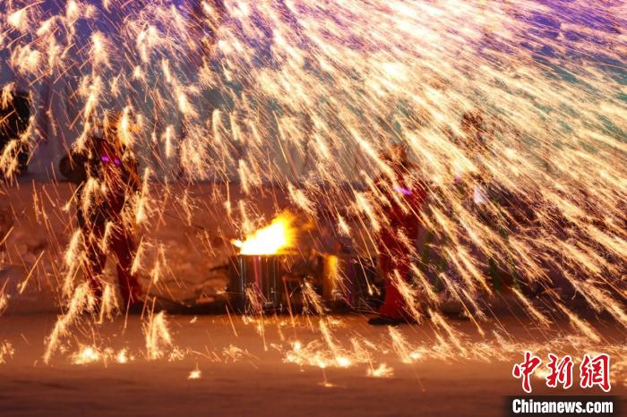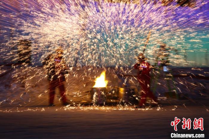 近日,新疆乌鲁木齐市水磨沟区天山明月冰雪城,非遗技艺“打铁花”民俗活动正在上演,为每日前来游玩的游客带来一场场视觉盛宴。“打铁花”是传统的中国经典民俗技艺,比较考验师傅们的功力,师傅们将烧滚烫的铁水打向空中,变成绚丽的烟花。图为师傅将滚烫的铁水打向空中。中新网