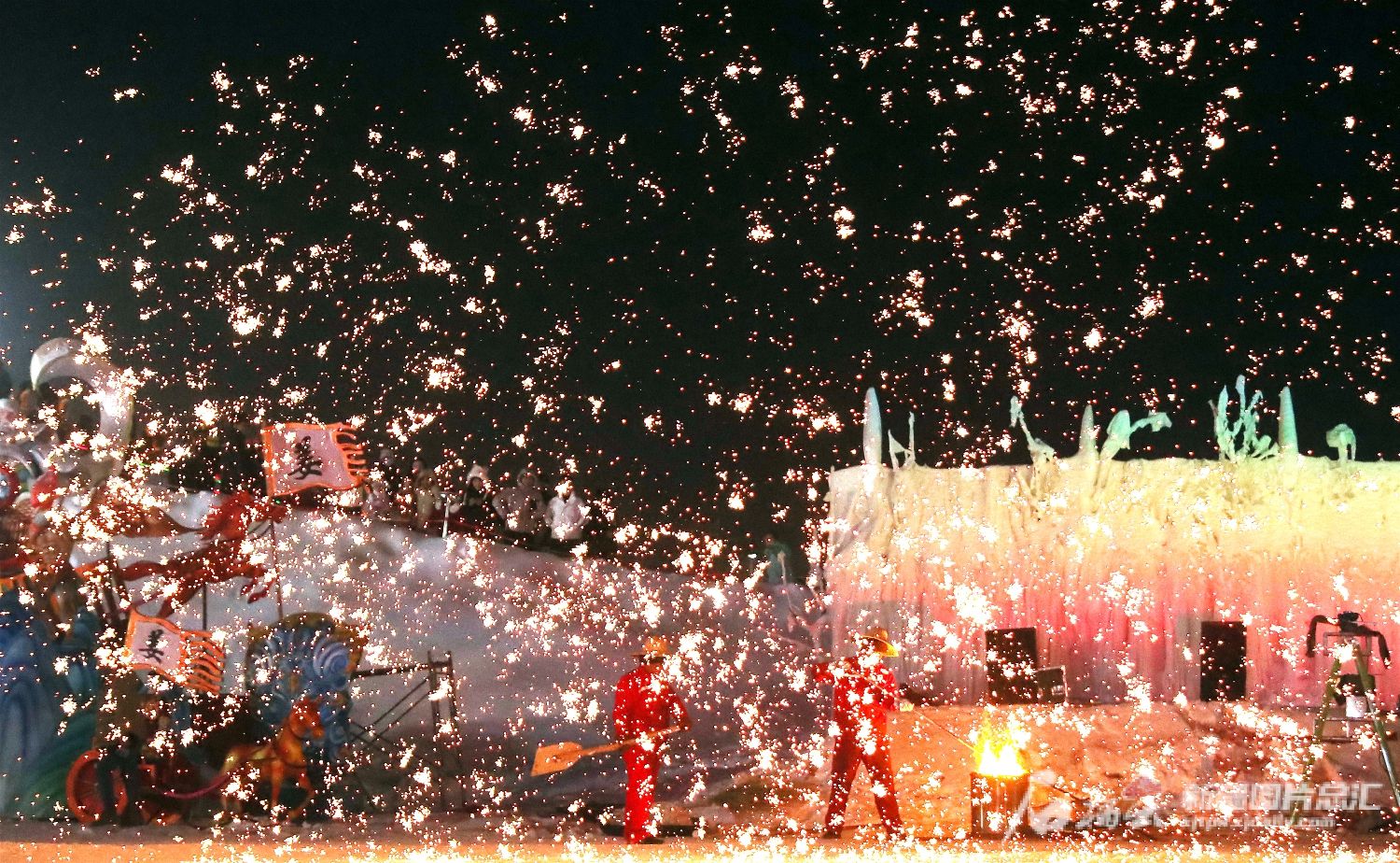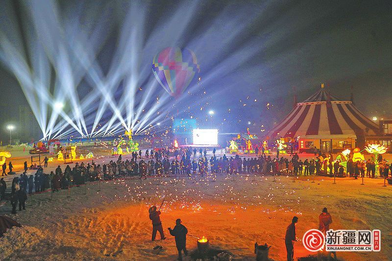 精彩的打铁花表演引来许多游客驻足观赏。新疆网
