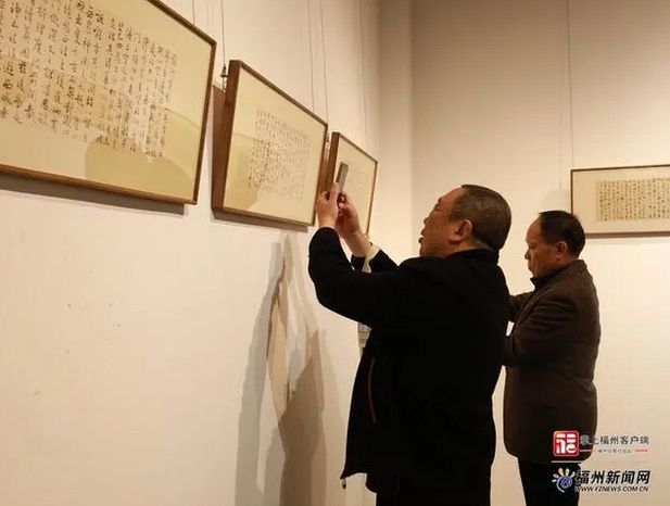 1月8日,纪念严复诞辰170周年翰墨展在福建省画院开幕,展览重点展出严复先生临帖、信札、条幅、中堂、对联、册页等100件,当代书法家书写严复名言、警句、诗词70件。据悉,本次展览向社会公众开放,将持续至1月27日。图为展览吸引观众参观拍照。福州新闻网
