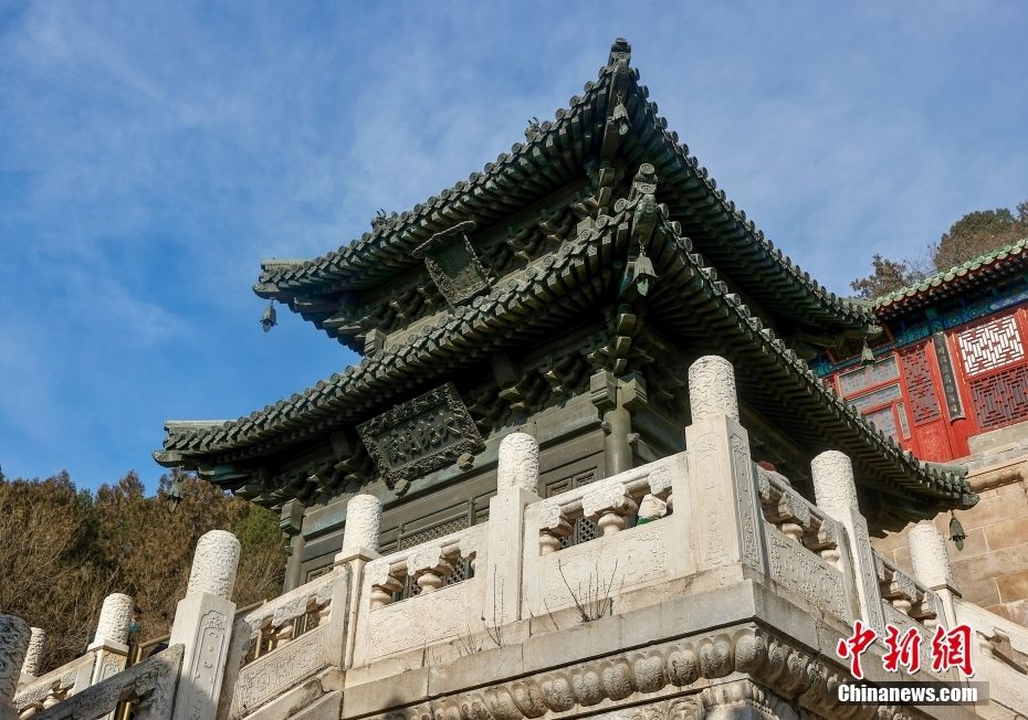 颐和园宝云阁始建于清乾隆二十年(1755年),采用中国传统的拨蜡法铸造而成,通高7.55米,重约207吨。宝云阁坐北朝南,四面装修菱花窗、门,双层四角各有1个铜铃。宝云阁的梁、柱、枋、椽、斗拱、顶瓦、宝顶、门窗以及匾额皆为铜铸。图为1月10日拍摄的北京颐和园宝云阁。中新网