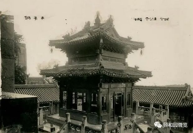 宝云阁原有铜门12扇、铜窗20扇、四面门窗上共有菱花形铜窗芯70页。因1860年“英法联军”的焚毁劫掠和1900年庚子之难,20世纪初,宝云阁共散佚10扇铜窗和31页铜窗芯。图为民国时期缺失了铜窗的宝云阁。颐和园微览公众号