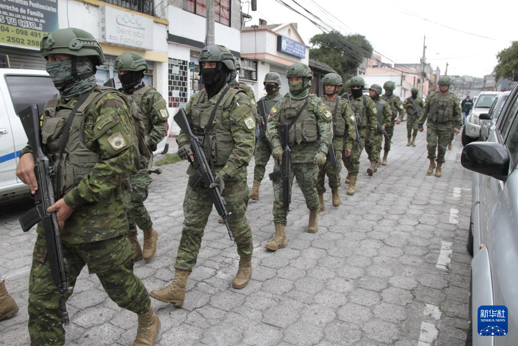 厄瓜多尔总统诺沃亚1月8日宣布,“因严重内乱”,全国进入为期60天的紧急状态。9日,一伙蒙面枪手闯入瓜亚基尔市一家电视台并挟持电视台工作人员后,诺沃亚又宣布,该国进入“国内武装冲突”状态。图为1月9日,厄瓜多尔军方人员在首都基多巡逻。新华社