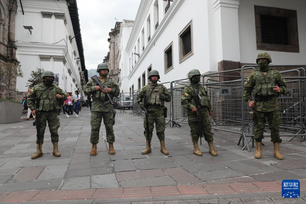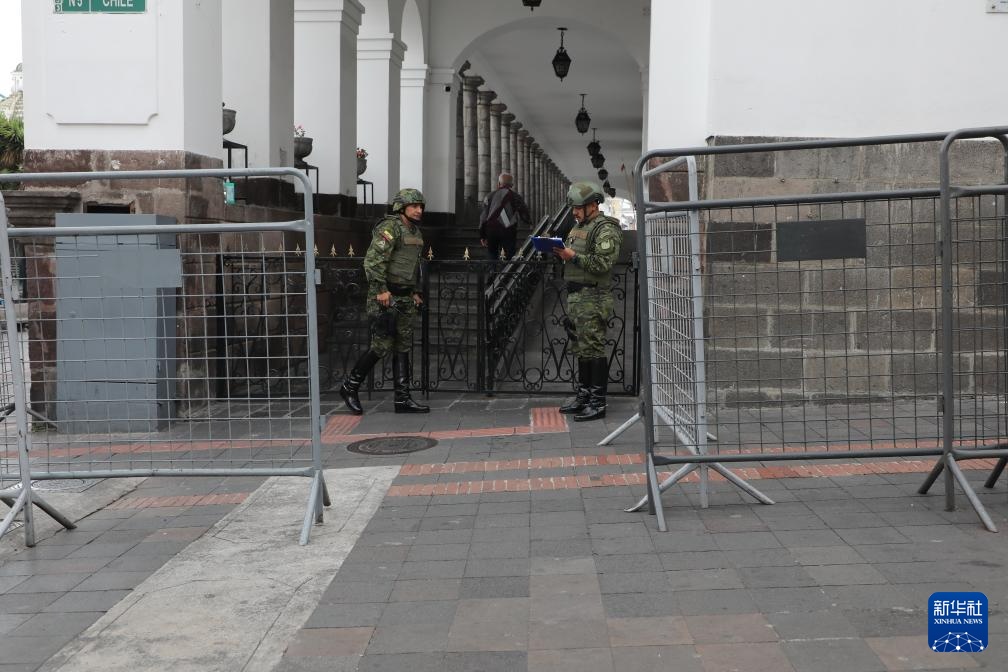 1月9日,厄瓜多尔军方人员在位于首都基多的总统府外执勤。新华社