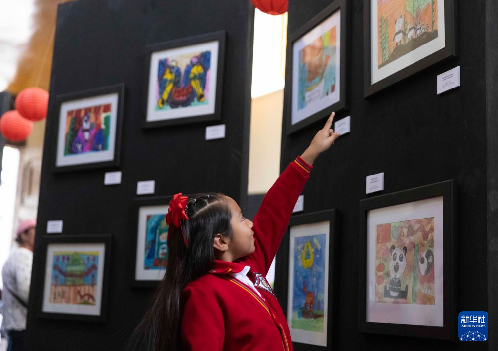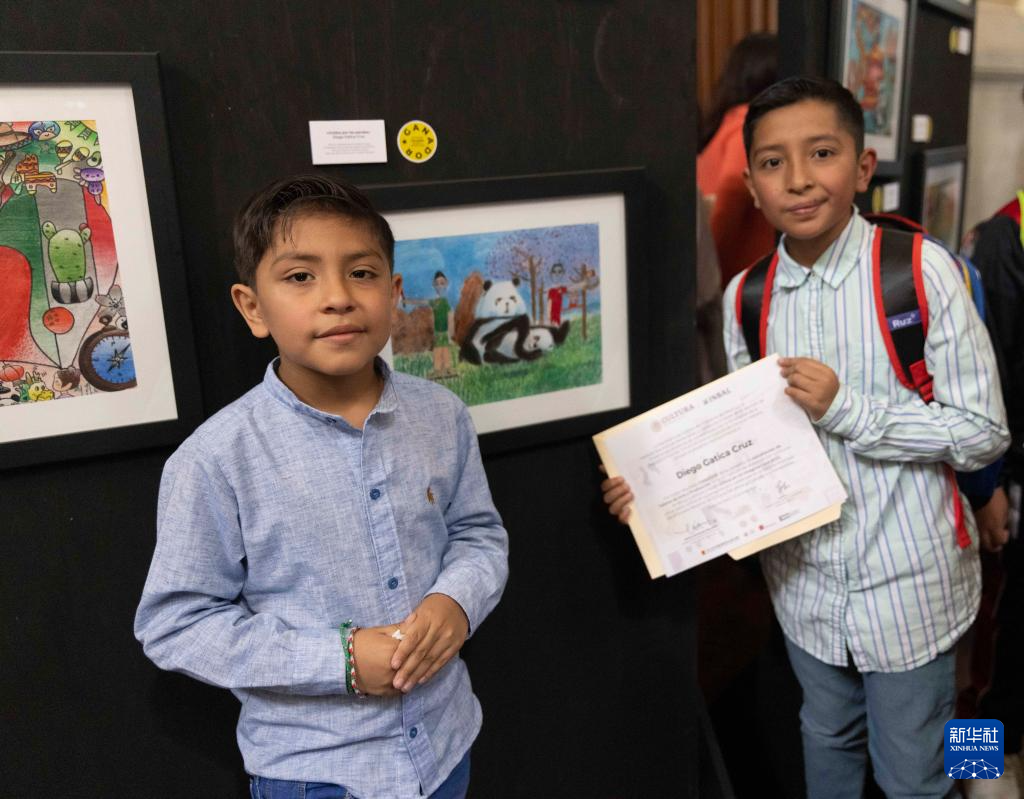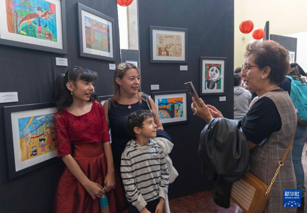 第十届“我想象中的中国”儿童绘画比赛10日在墨西哥首都墨西哥城举行颁奖仪式暨入围作品展开幕式,画作展现了墨西哥儿童对中国的想象与美好向往。图为1月10日,在墨西哥首都墨西哥城的活动现场,孩子们在画作前留影。