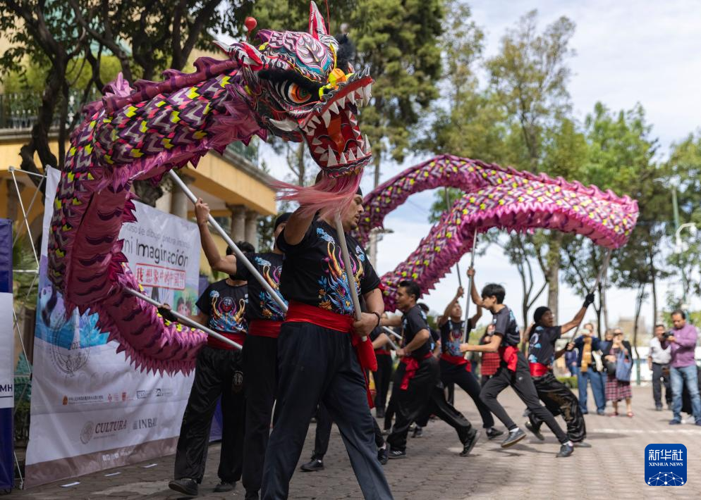 1月10日,在墨西哥首都墨西哥城的活动现场,演员表演舞龙。