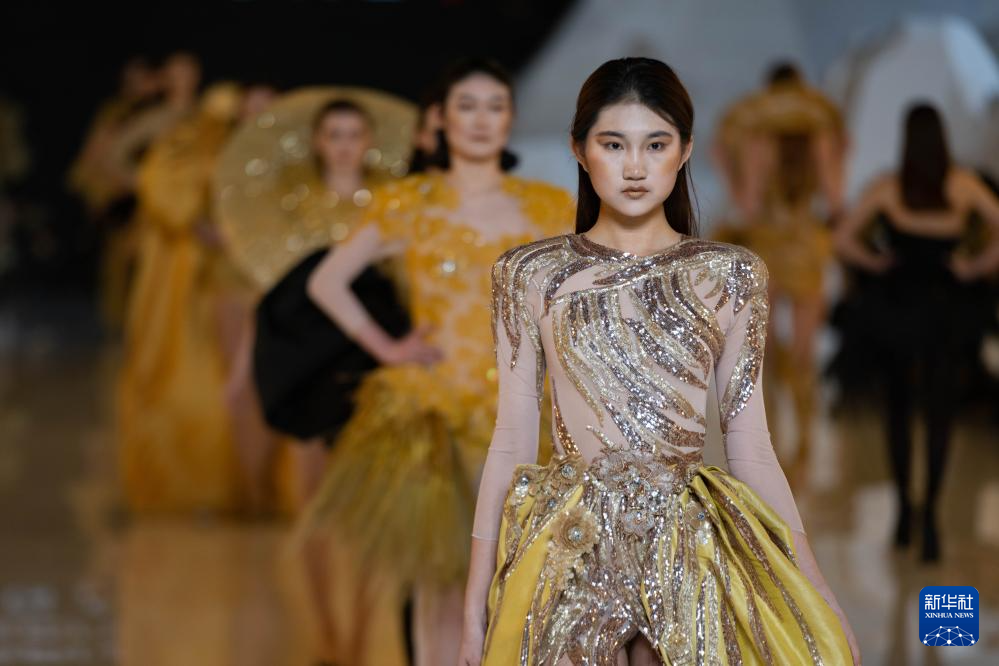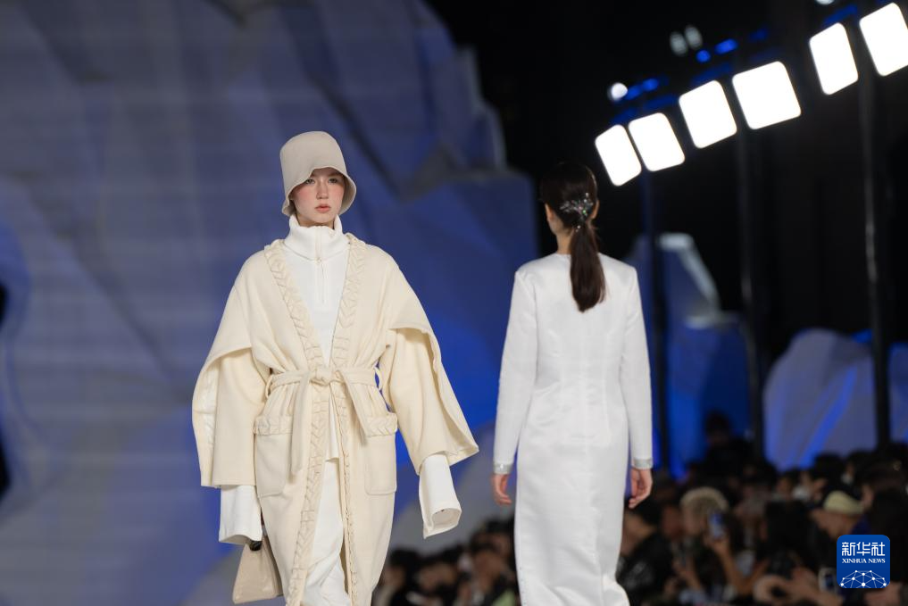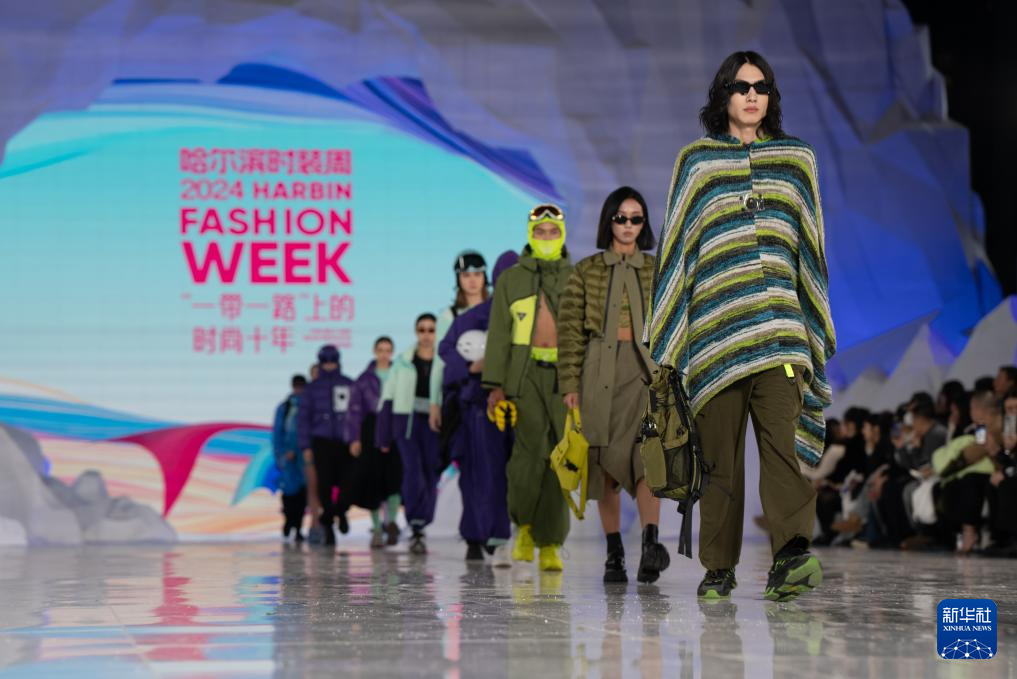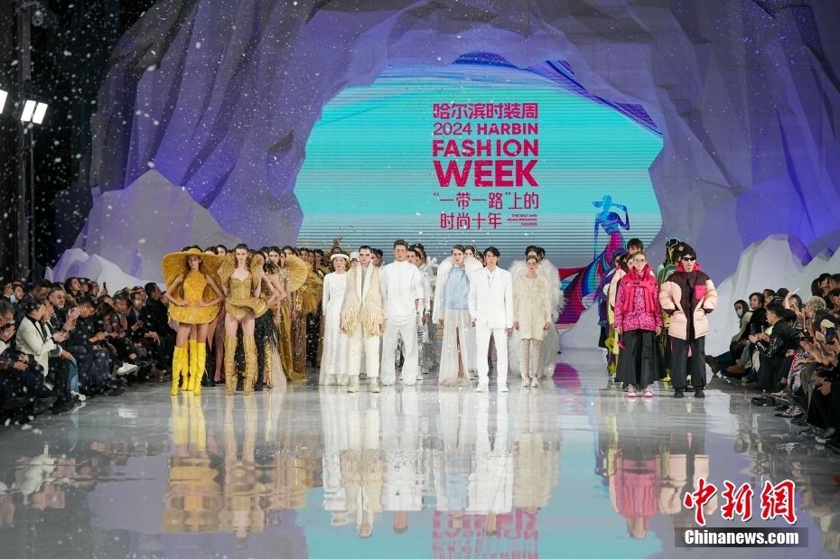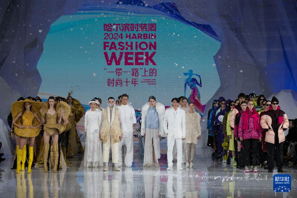1月11日,2024第十届哈尔滨国际时装周启幕。本届时装周以“‘一带一路’上的时尚十年”为主题,将围绕“大秀、大会、签约、展览、节庆”五大活动板块,举办国际设计师发布秀、百大成衣品牌秀、龙江非遗文化秀演、世界时尚设计师沙龙等一系列创新活动。图为1月11日,模特在2024第十届哈尔滨国际时装周开幕式上展示服装。新华社