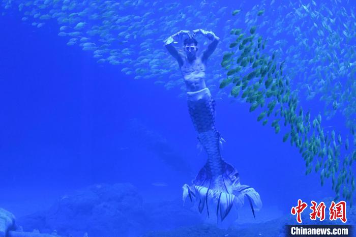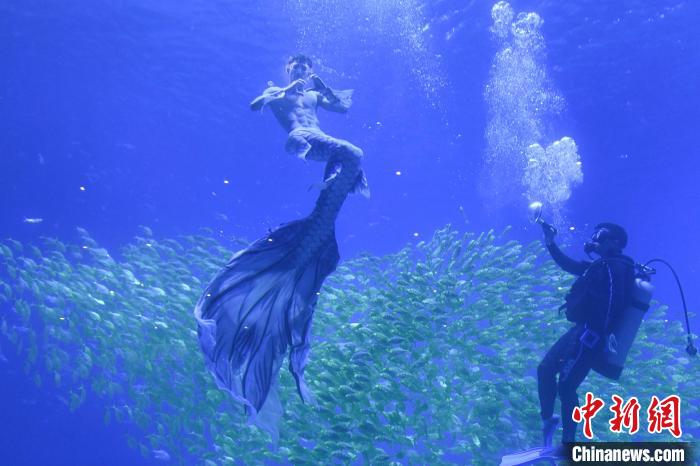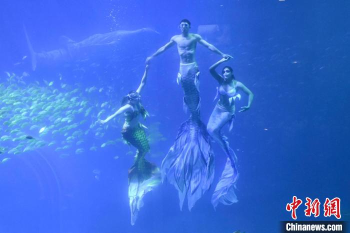近日,位于湖南长沙的湘江欢乐海洋公园开园后,人鱼秘境场馆的美人鱼表演在网络上得到网民热议。表演者之一,古巴籍前跳水运动员伊曼努尔·加拉多以柔美与力量并存的演技获得游客喜爱。伊曼努尔·加拉多表示,自己喜欢游泳和大海,来到中国可以展示自己的才能,并向大家推广美人鱼这一项运动。图为伊曼努尔·加拉多(中)与其他美人鱼在水下表演。中新网