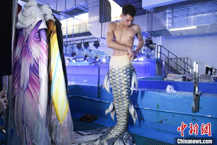 伊曼努尔·加拉多穿上美人鱼演出服装。中新网