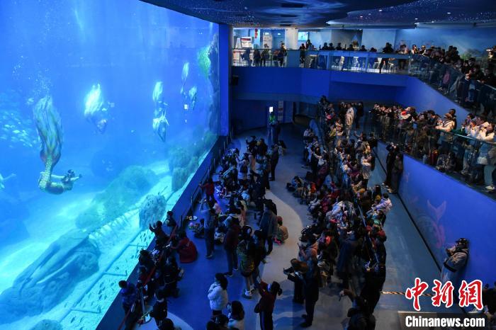 游客围观美人鱼表演。中新网