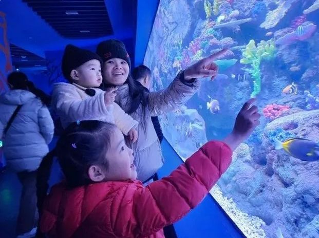 游客在湘江欢乐海洋公园观看鱼类。《中国旅游报》