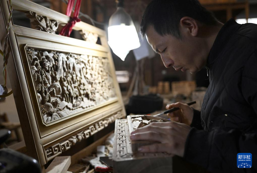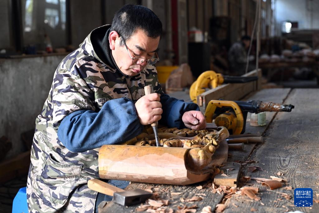1月12日,在安徽省黄山市歙县精华园旅游投资有限公司,工作人员在制作徽派仿古建筑配件。新华社