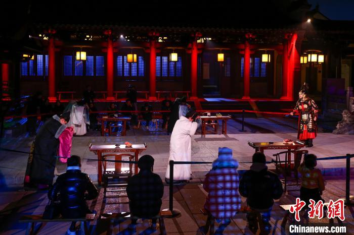 不同于传统的戏剧演出方式,《徽州府有喜》整部剧依托徽州府衙建筑群,通过行进式的演出,在府衙各类场景中进行不同剧情的表演,观众随着剧情的深入,移步换景,好似穿梭时空,做客徽商鼎盛时期的徽州府。图为1月10日,演员在歙县徽州古城府衙内表演。中新网