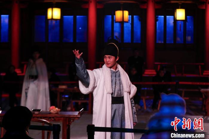 在徽州古城,有这样一群“00”后,他们以徽州历史和民间故事为背景,将徽州元素巧妙地融入,加工创作出沉浸式话剧《徽州府有喜》。演员们用年轻人喜爱的方式传播徽文化,为徽州文化的传承和发展注入新的活力。图为1月10日,演员在歙县徽州古城府衙内表演。中新网