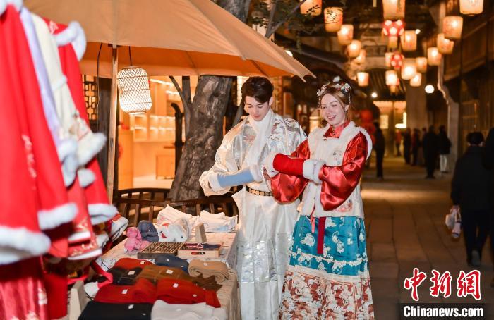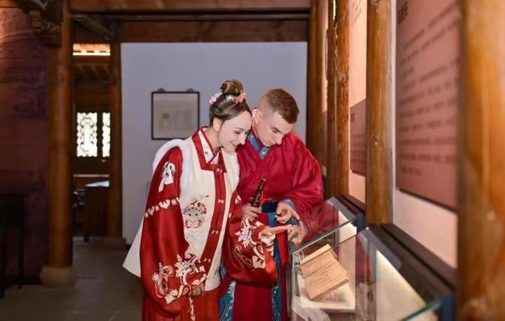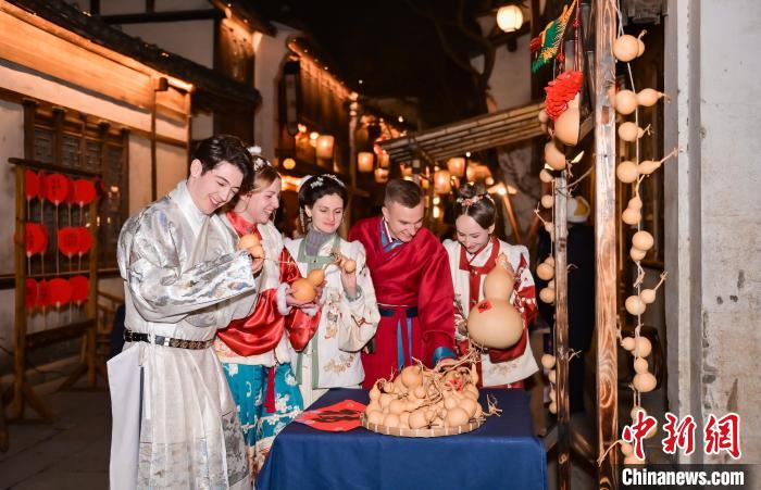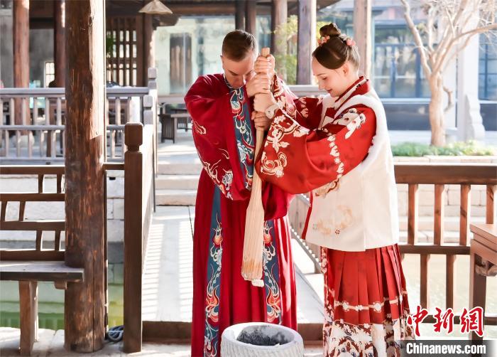 近日,8位全网粉丝超200万+的外籍博主齐聚浙江省嘉兴市的濮院时尚古镇,开启一场时尚与传统共舞的新潮年味之旅。体验过后,他们将分享各自眼中的“濮院时尚中国年”。图为外籍博主们被中国传统服饰吸引并体验其魅力。中新网/濮院时尚古镇供图