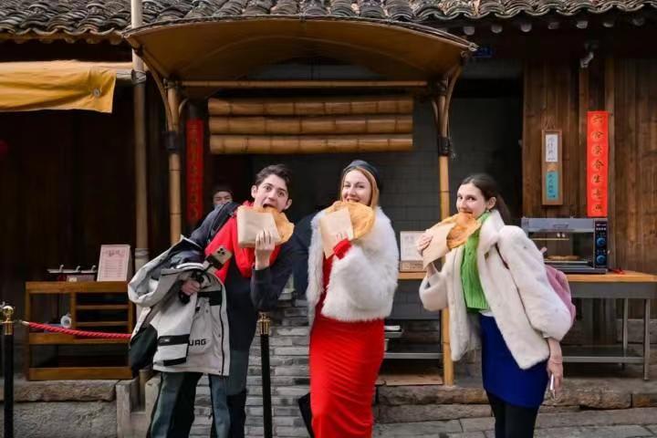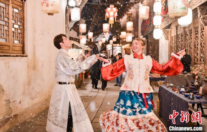 腊月已至,年味渐浓。来自埃及、白俄罗斯、俄罗斯、刚果金、乌克兰等国家的外籍博主走进濮院时尚古镇,游江南风光、逛热闹市集、赏非遗演艺、享特色美食。图为外籍博主们在濮院时尚古镇体验新年限定的“今日有雪”活动。中新网/濮院时尚古镇供图