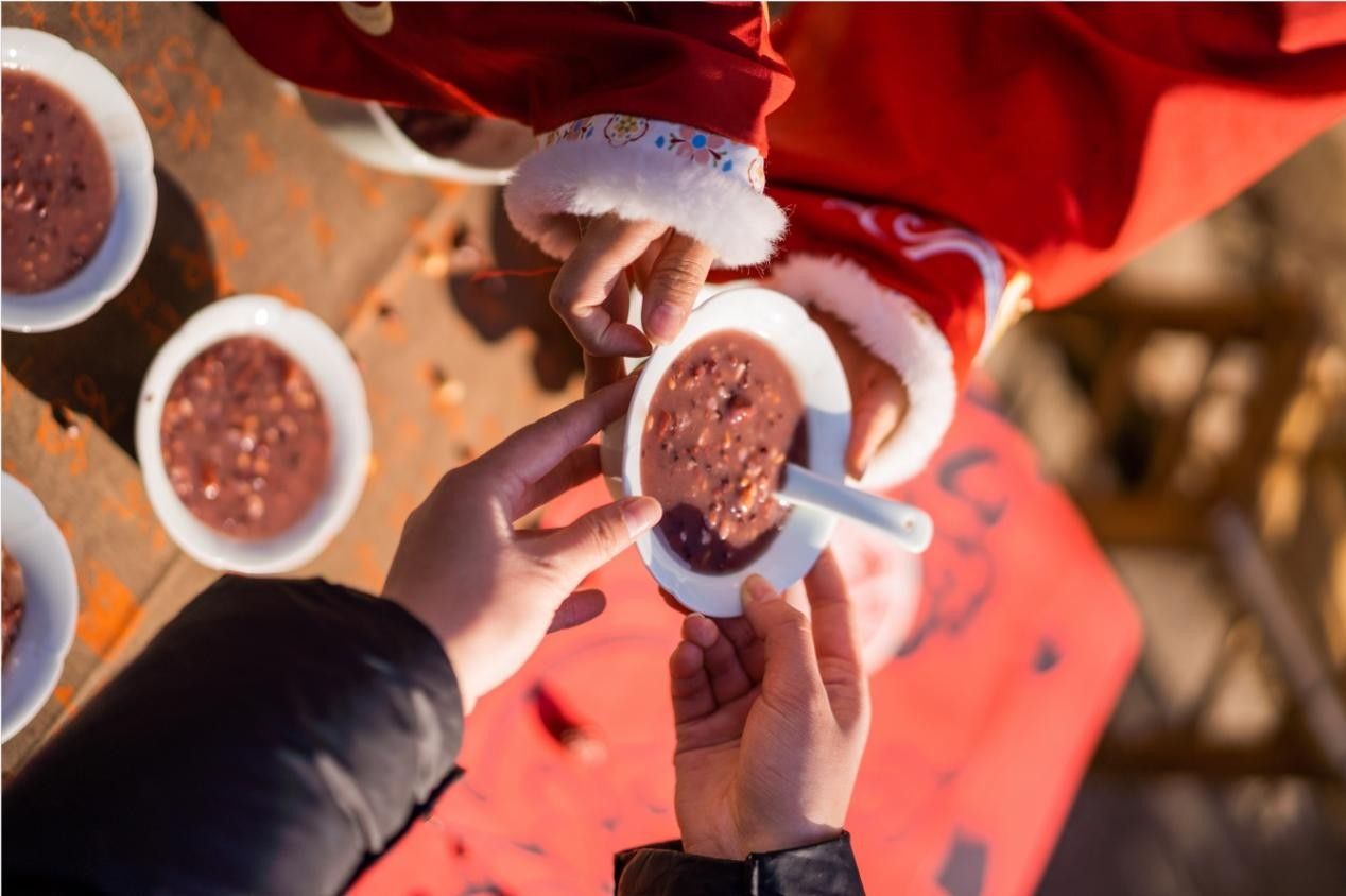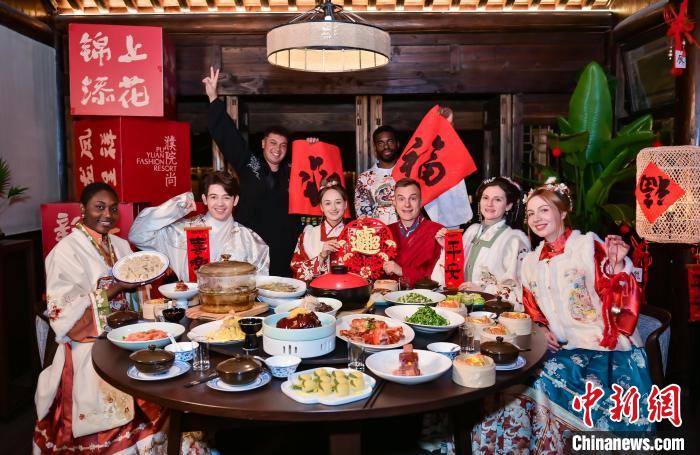 外籍博主们在濮院时尚古镇吃濮院年夜饭。中新网/濮院时尚古镇供图