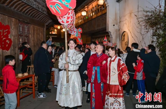 外籍博主们手举鱼灯随着巡游队伍前行。中新网/濮院时尚古镇供图