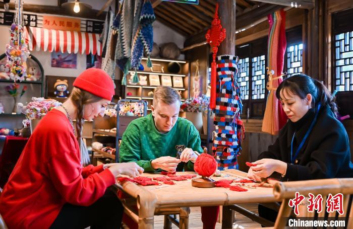 外籍博主们在濮院毛线铺体验中国结制作。中新网/濮院时尚古镇供图