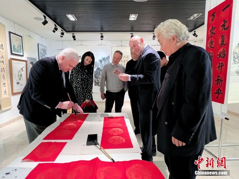 当地时间1月16日,“中国俄罗斯书法美术作品展”在莫斯科中国文化中心举办。活动展出中俄书法美术作品120余幅。活动期间,中俄书画家现场创作书画作品,书写迎春“福”字、对联等,为观众送上中国新年祝福。图为俄联邦委员会国际事务委员会第一副主席、俄罗斯前驻华大使杰尼索夫(左一)现场挥毫泼墨。