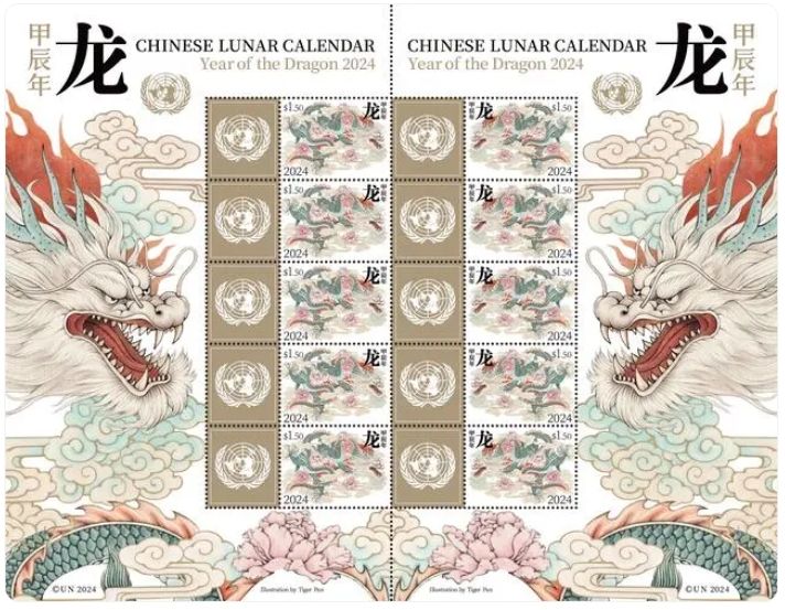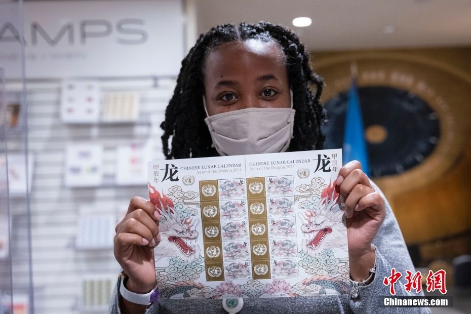 邮票龙图案由中国设计师潘虎创作。邮票图案为中国工笔画风格的龙,附票为白色联合国标志及金色底色。图为纽约联合国总部邮管处销售点的工作人员展示甲辰龙年特别版邮票版张。中新网