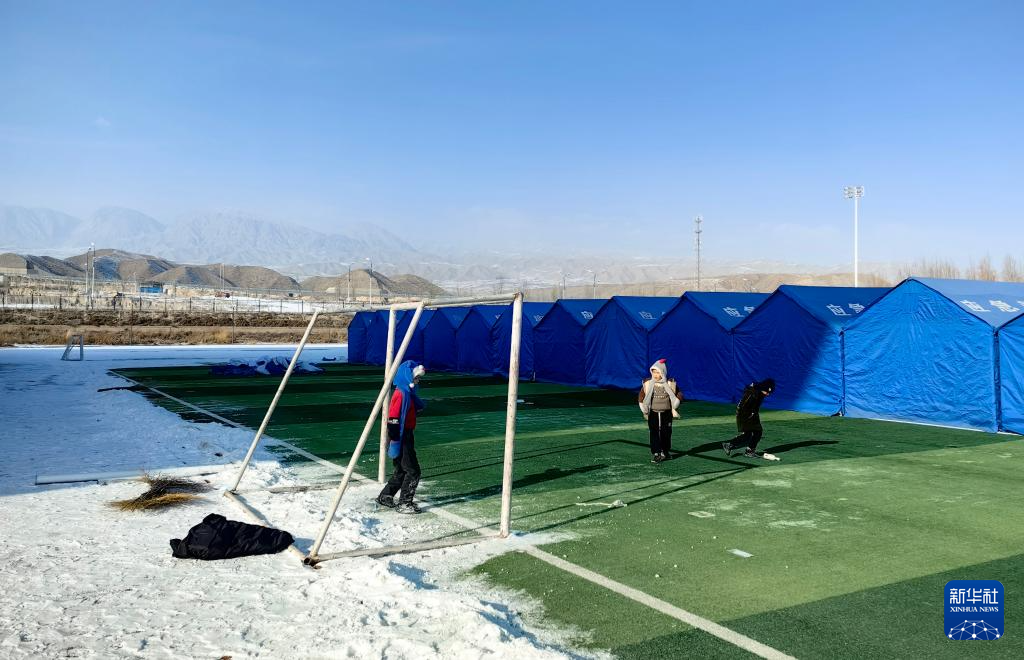 1月23日,在新疆阿合奇县一处集中安置点,孩子们在应急救灾帐篷前玩耍。新华社