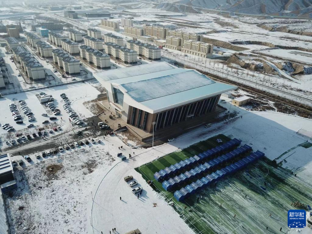新疆阿合奇县科技文化体育中心应急避难场所(1月23日摄,无人机照片)。新华社