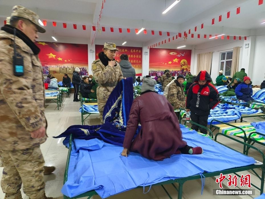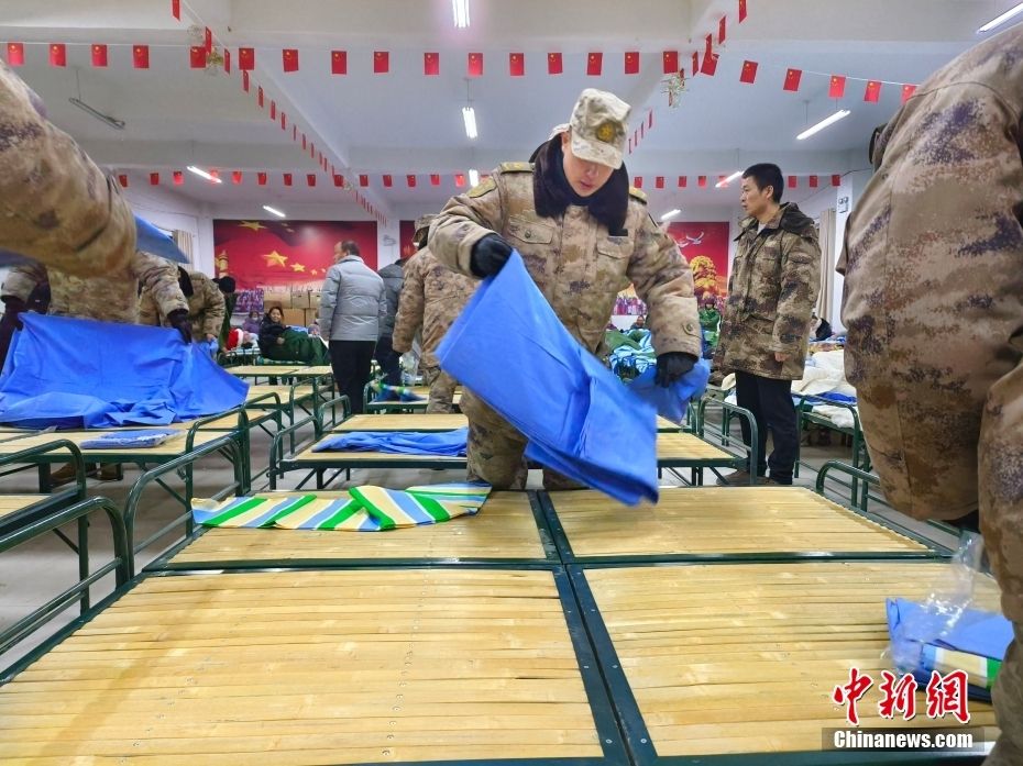 截至1月23日14时20分,新疆军区累计出动680多名救援官兵驰援救灾一线乌什县亚曼苏柯尔克孜族乡,入户排查、搭设帐篷,确保每名受灾民众有饭吃、有热水喝,基本生活有保障。图为官兵为民众搭建简易休息折叠床。中新网