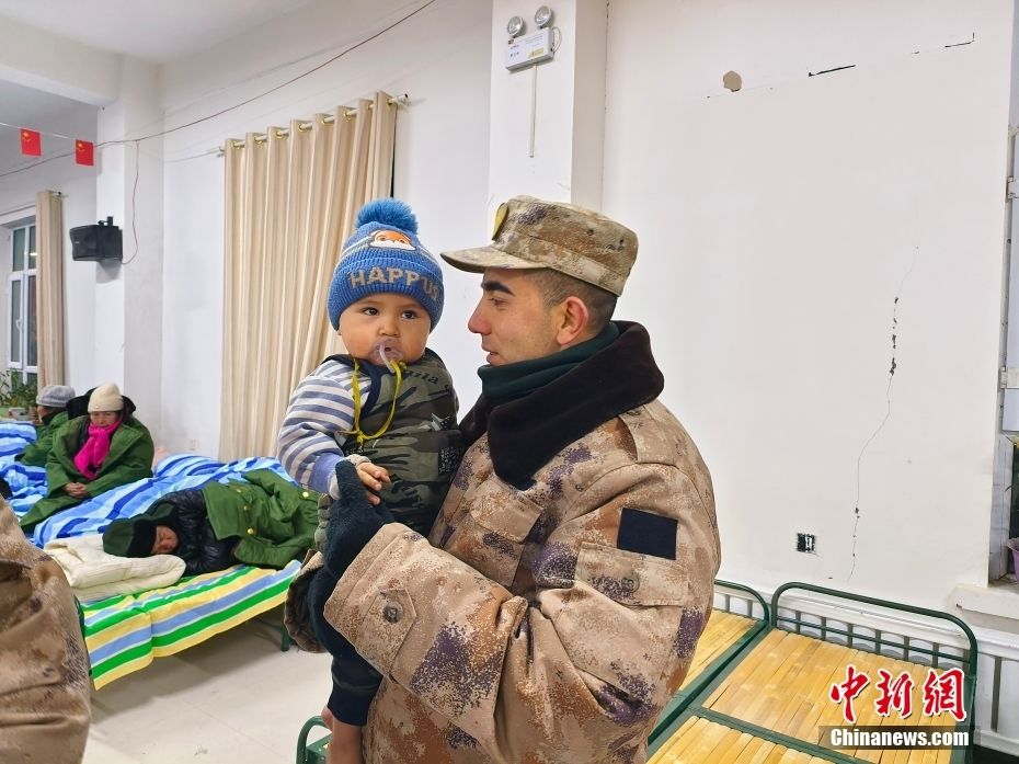 受灾民众身穿官兵提供的保暖衣物抱着孩子在临时救助点休憩。中新网
