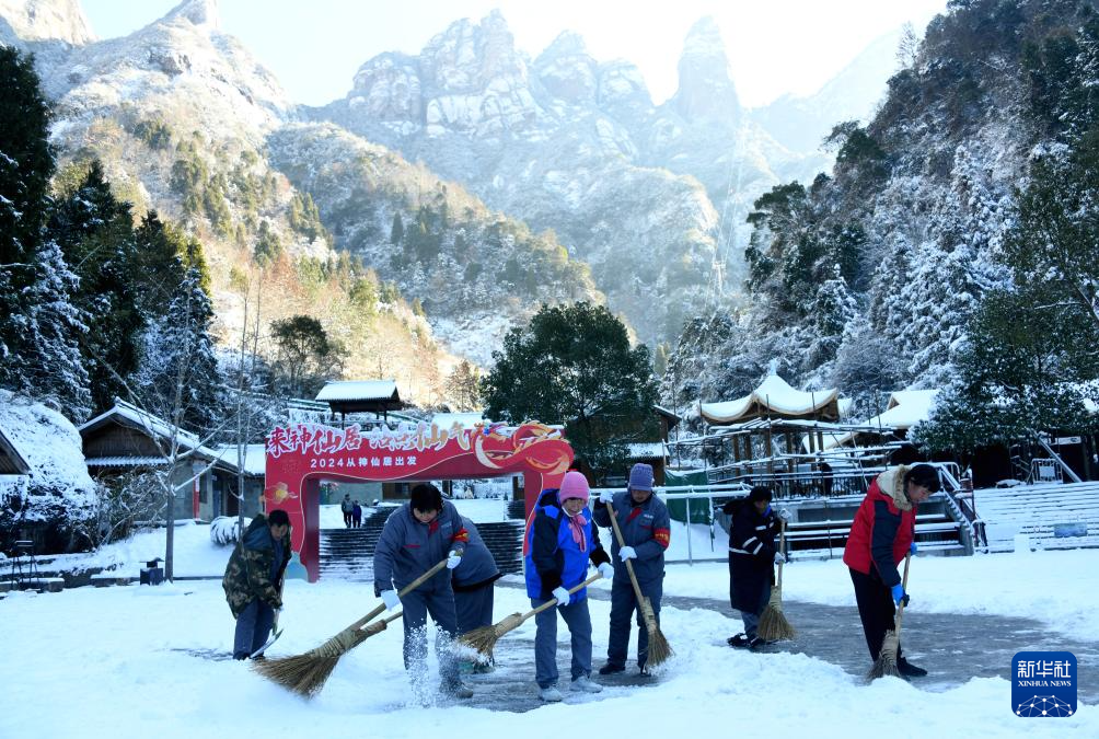 1月23日,浙江省台州市仙居县神仙居景区工作人员在清除旅游通道冰雪。新华社