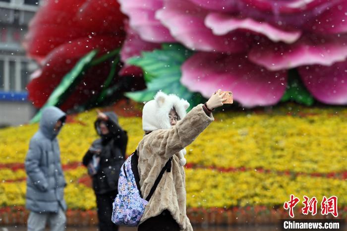 1月23日晚,四川省成都市主城区迎来2024年首场降雪,并持续到24日白天。图为市民雪中出行,拍照留念。中新网