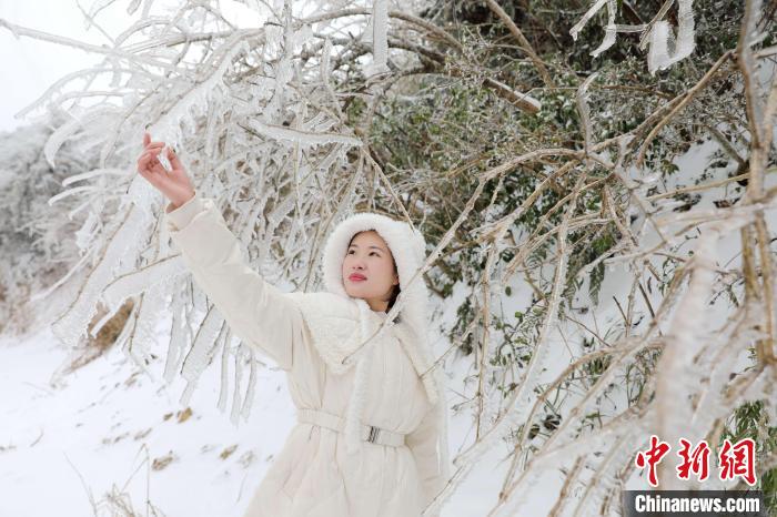 近日,受强冷空气影响,广西多地持续降温出现寒潮天气。在广西三江侗族自治县,多地雪景如画、风光旖旎,众多游客前往赏雪游玩,迷人的冰雪风光让人流连忘返。图为一名游客在广西三江侗族自治县独峒镇大塘坳赏雪。中新网