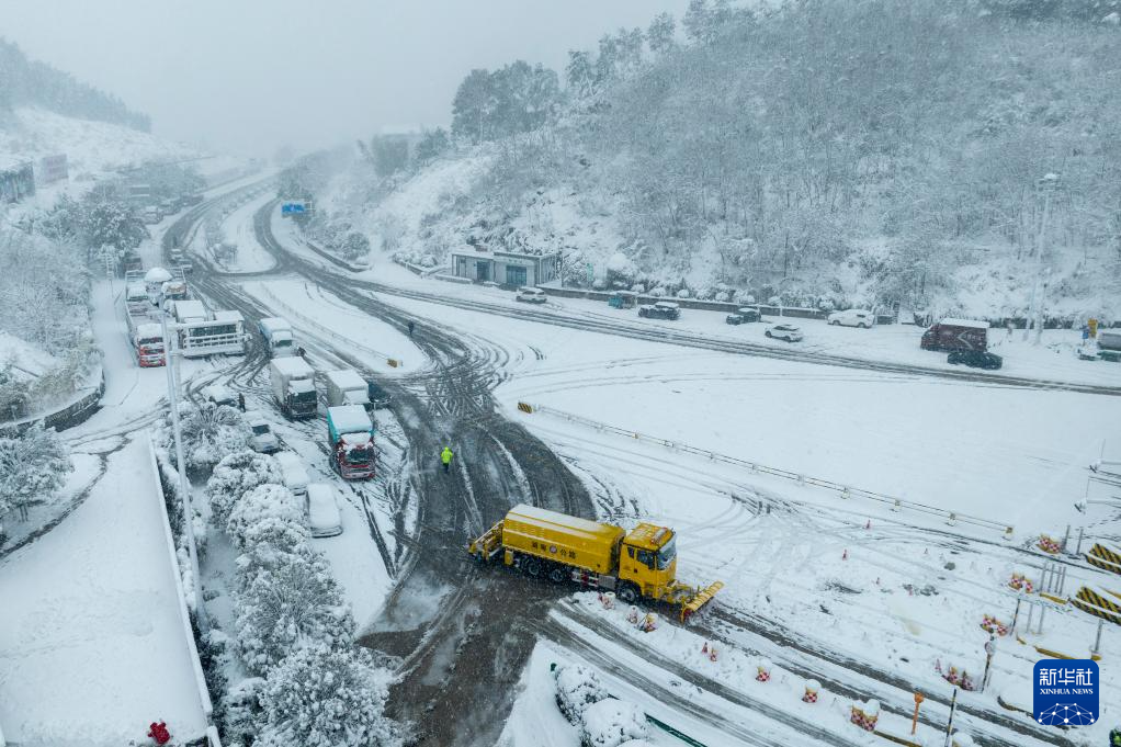 1月22日,在湖南省娄底市一高速收费站,除雪车在作业(无人机照片)。新华社