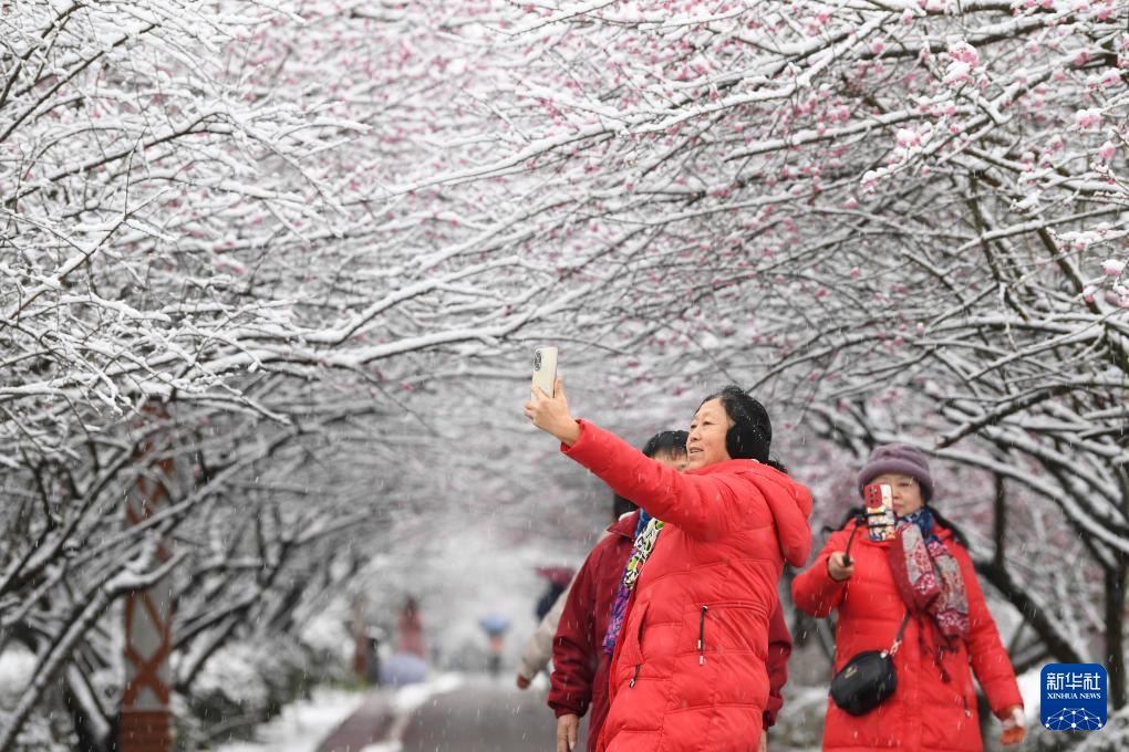 1月22日,在贵州省遵义市余庆县都市第三地生态园,市民在欣赏雪中梅花。新华社