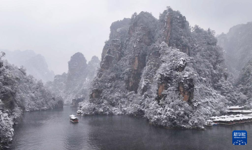 1月22日,游人乘船在张家界市武陵源宝峰湖景区赏雪游玩(无人机照片)。新华社