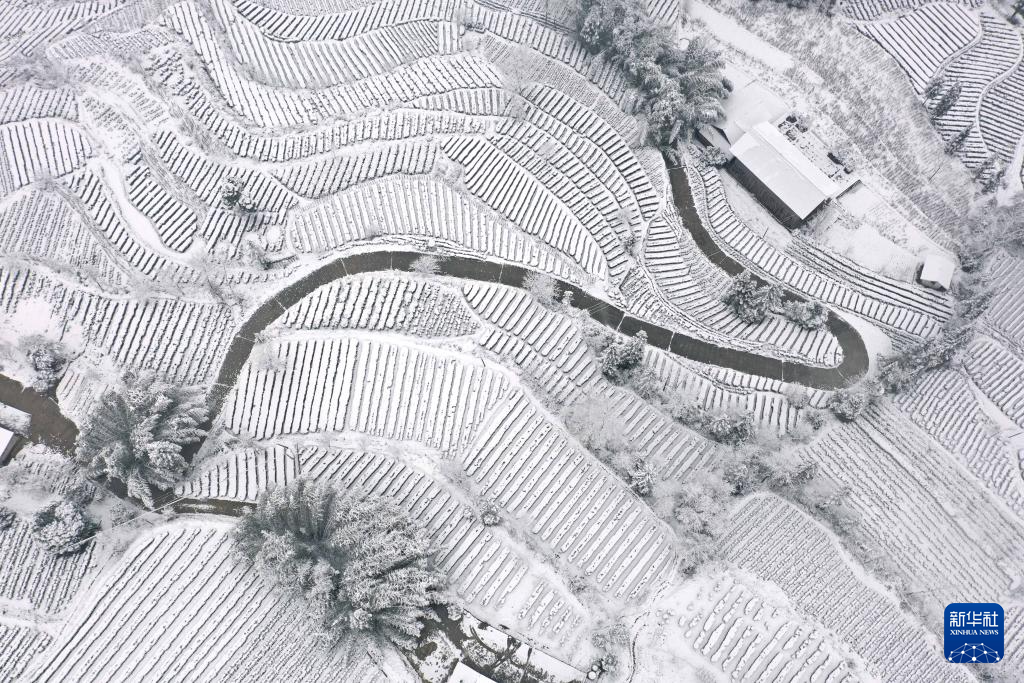 1月22日,湖北省宣恩县境内的茶园梯田被白雪覆盖(无人机照片)。新华社