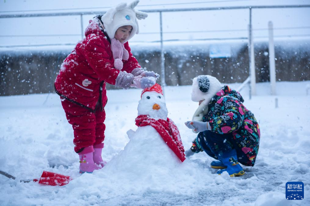 湖南省娄底市娄星区一小区内,小朋友在堆雪人。新华社