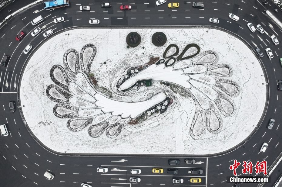 江苏省南京市街头的植被景观被雪覆盖后显现出孔雀尾羽般的图案,栩栩如生。中新网