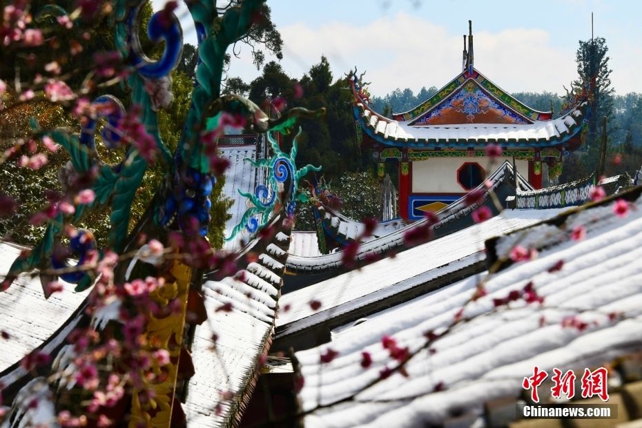 福建省福州市闽侯县雪峰崇圣寺雪落房檐上,为多彩的寺庙建筑增添层次感。中新网
