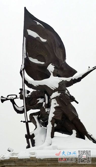 江西省南昌市建军雕塑广场上“战士”个个身披银装。大江网