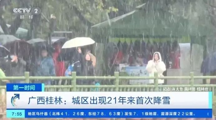 受寒潮影响,广西多地迎来降雪天气,桂林市城区更是出现21年来的首场降雪。降雪引起众多游客拍照,记录下这一难得的景观。大陆央视新闻客户端