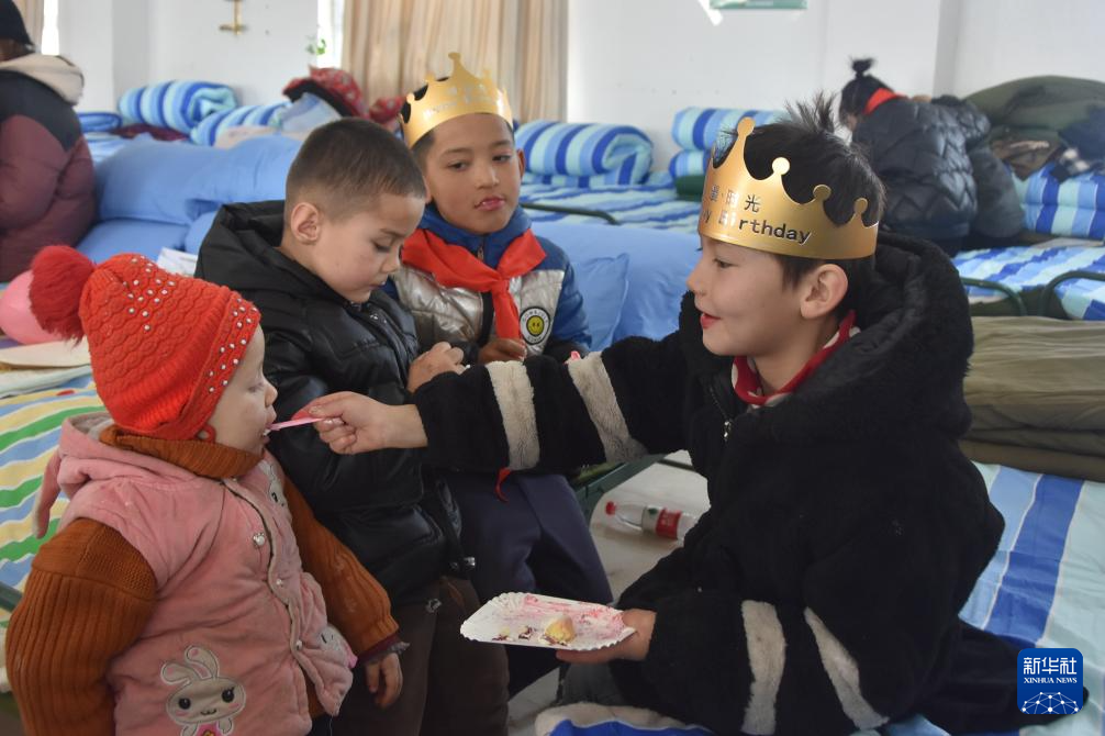 1月25日,一场爱心生日会在新疆乌什县亚曼苏柯尔克孜族乡尤喀克亚曼苏村一处安置点举办,孩子们的笑容让安置点里暖意融融。1月23日2时9分,新疆阿克苏地区乌什县发生7.1级地震。尤喀克亚曼苏村村委会安置点儿童数量相对较多,得知有孩子过生日,爱心人士给孩子们送来了蛋糕。图为1月25日,在尤喀克亚曼苏村的一处安置点里,工作人员为小朋友们分发蛋糕。新华社