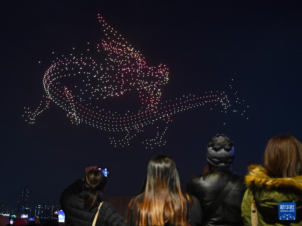 近日,为响应香港特区政府“日夜都缤纷”主题活动,并迎接中国农历新年,“缤纷香港”大型无人机灯光秀在香港湾仔海滨举办,千架无人机组成多幅香港标志性图案,扮靓“东方之珠”夜空。图为1月28日,无人机在维港夜空组成龙形图案。新华社