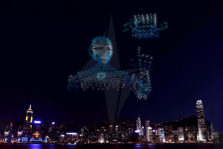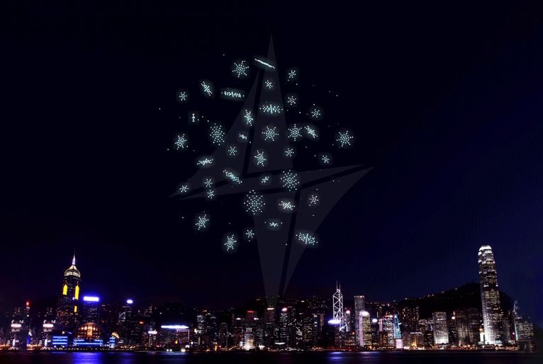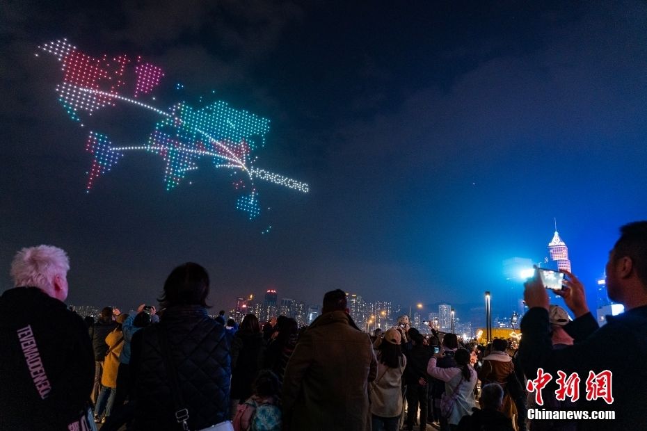 1月28日,无人机在维港夜空组成维港天际线图案。中新网
