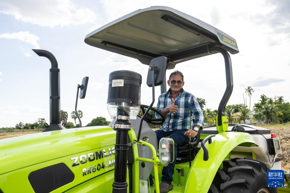 2月2日,中巴农业机械化合作示范项目启动仪式在巴西阿波迪举行,第一批来自中国7家农机企业共31台(件)设备正式交付给巴西农村劳动者组织。图为2月2日,在巴西阿波迪,一名男子坐在一款中国生产的农机上竖起大拇指。