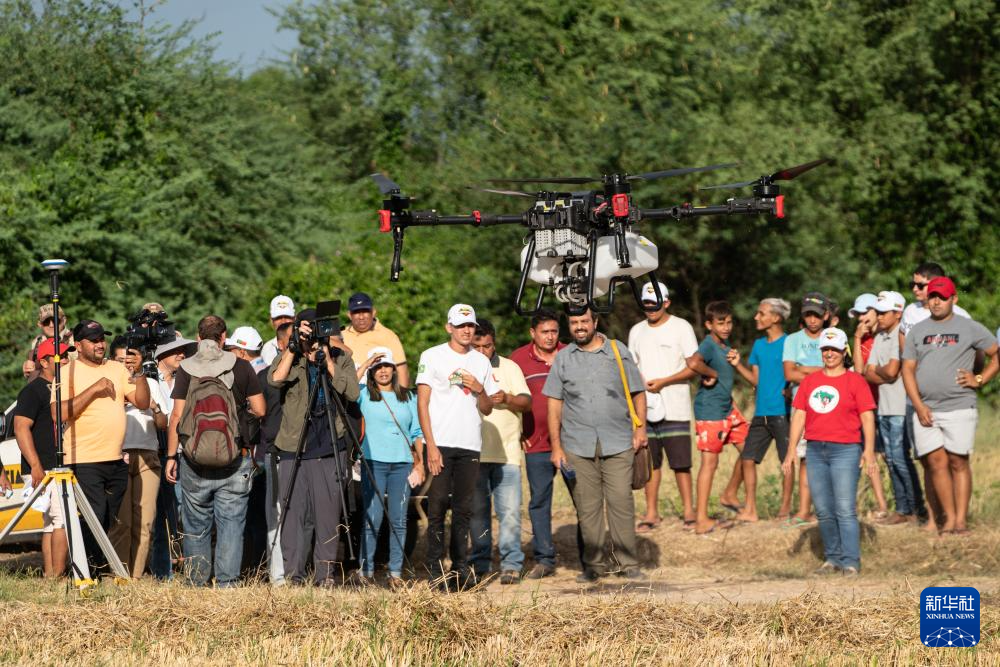 2月2日,在巴西阿波迪,人们观看一款中国生产的农用无人机。