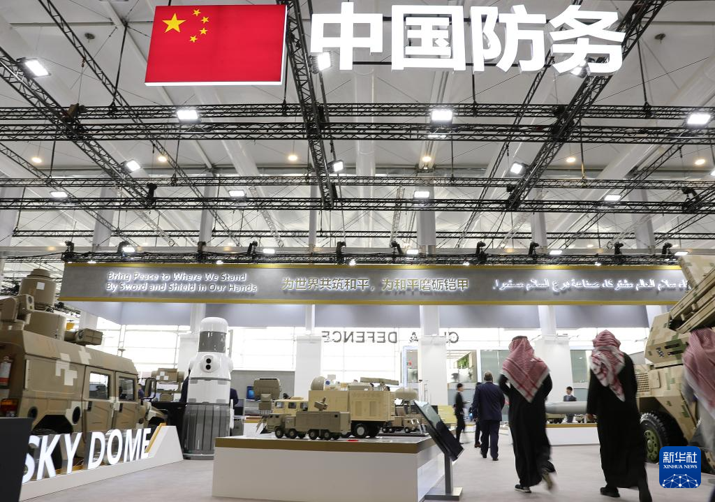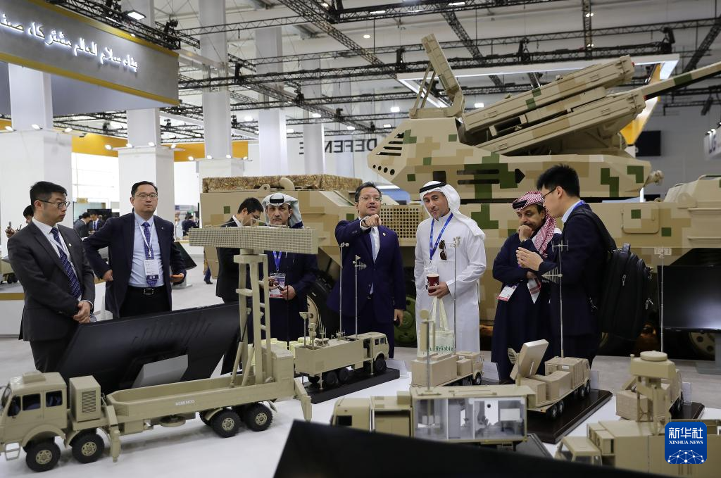 沙特阿拉伯第二届世界防务展于2月4日至8日在首都利雅得举办,中国防务展团和中国空军八一飞行表演队应邀参展并进行飞行表演。图为2月5日,在防务展现场,人们在中国展区洽谈参观。新华社