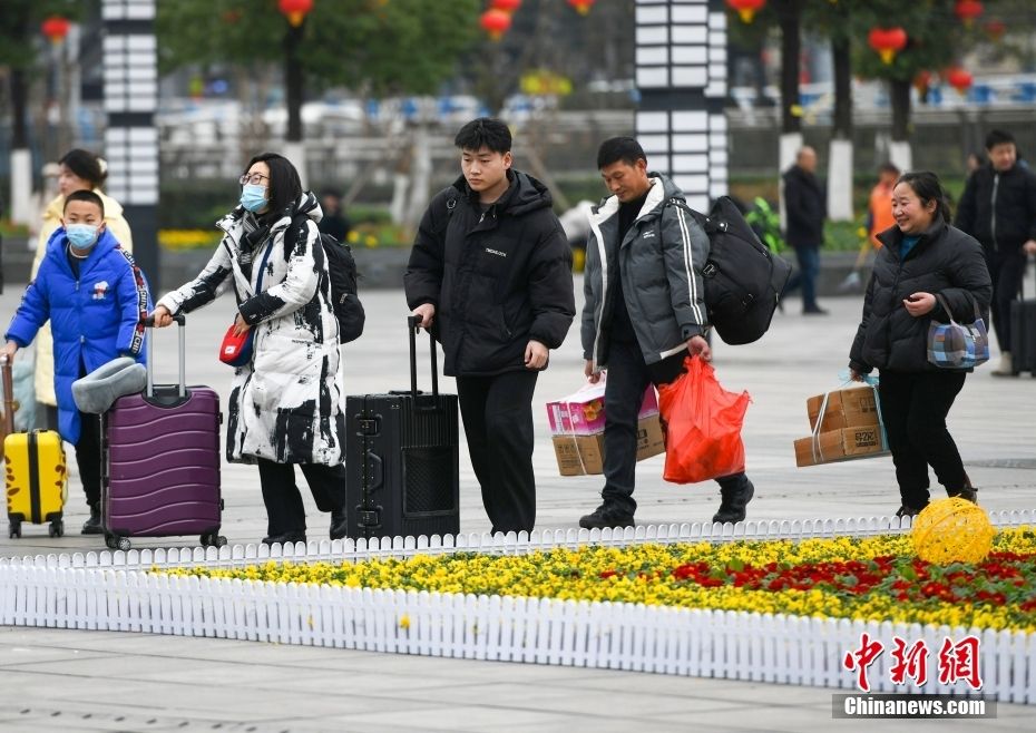 2月5日,重庆火车北站北广场上,旅客带着行李踏上返乡路。中新网